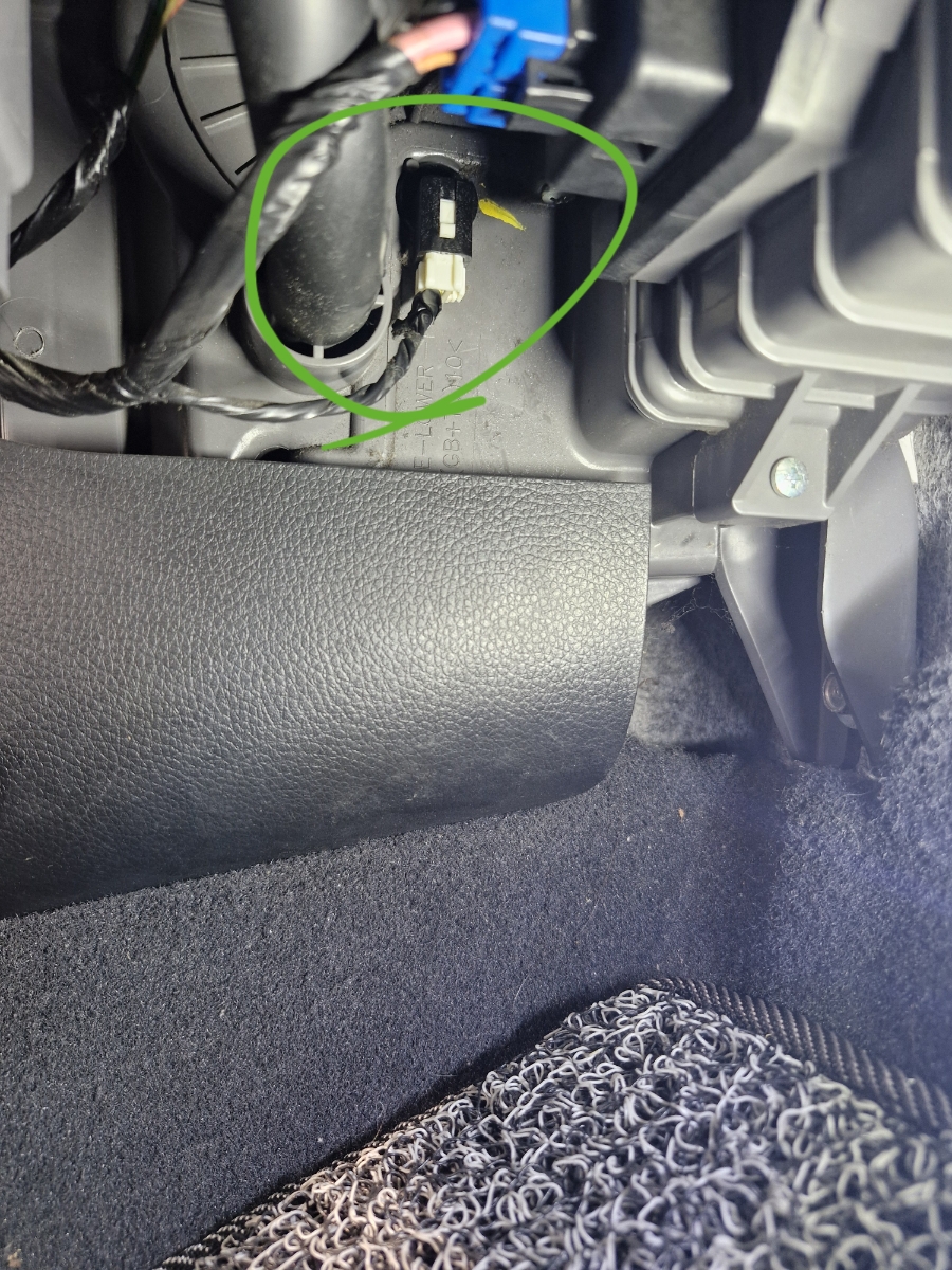 크래쉬 패드 언더 커버를 탈거하고 조수석 바닥에 드러 누워서 작업하면 된다. 글러브 박스까지 탈거하면 좀 더 수월하다. 2핀 커넥터(흰색)만 분리하면 매우 쉬운 작업이다. 근데 위치가 지랄 맞아서 쉽지만은 않다는 것이 함정이지롱~~.