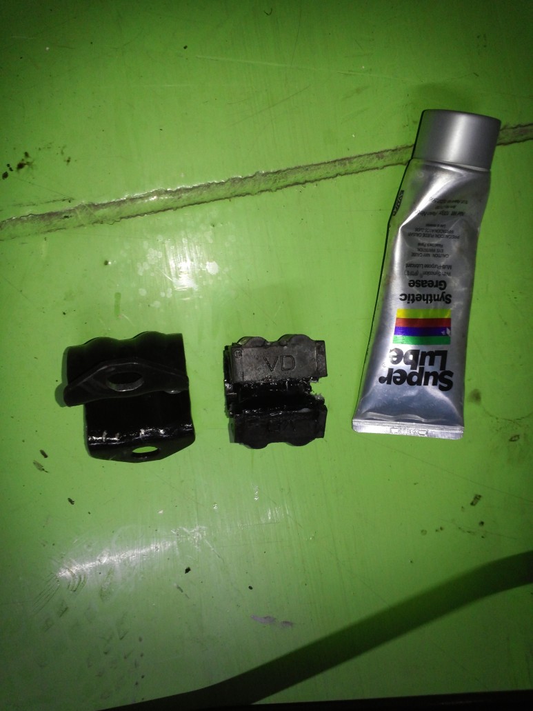 신품 바를 걍 장착해도 되지만 부싱에 그리스를 충분히 발라주면 삐걱 거리는 소음 발생 방지에 도움이 되기에 바에서 브라켓을 탈거한다. 브라켓이 엄청 빡세게 조립되어 있기에 브라켓 탈거가 쉽지 않다. 난 망치로 때려서 탈거했다. 브라켓 홀 구멍은 차체 홀 구멍과 일치하기 않기에 브라켓 구멍을 넓혀주어야 한다. 준비한 줄(야스리)로 갈아서 구멍을 확장한다. 브라켓 홀 구멍 직경이 8 mm 정도이므로 이 구멍에 쏙 들어가는 원형 형태의 줄이 있어야 한다. 당구장에 있는 직사각형의 넓적한 형태의 줄은 당연히 사용불가다. 줄로 한 10여분 동안 작업하면 브라켓 2개의 구멍 총 4개를 확장할 수 있다. 약간만 넓히면 된다. 약 2-3 mm 정도(줄로 어느 정도 갈아내고 구품 브라켓에 대봐서 어느 정도 맞는지 눈대중으로 판단)