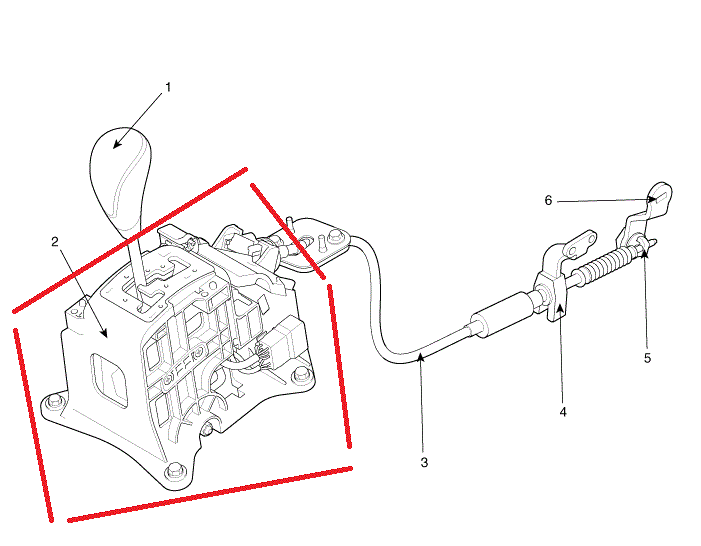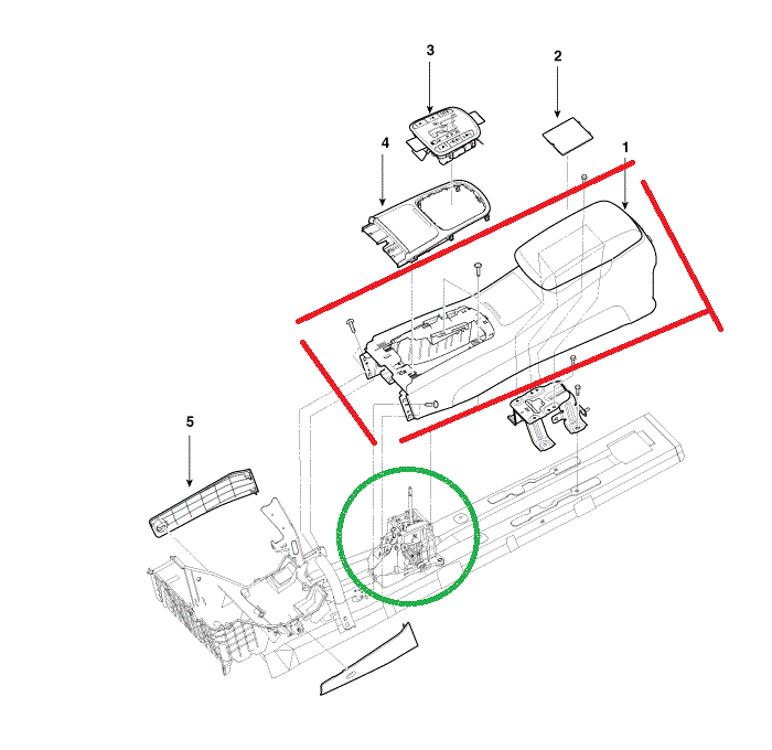 솔레노이드에 접근하기 위해서 플로어 콘솔(적색 사각형)을 통째로 탈거해야 한다. 그래야 녹색으로 표시된 레버 어셈블리에 접근할 수 있다. 레버 어셈블리 깊숙이 솔레노이드가 처박혀 있기 때문이다.