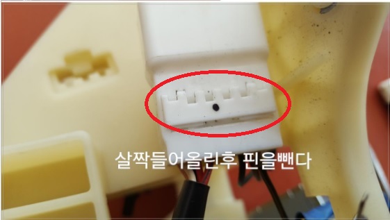 이제 암놈 커넥터 안쪽에서 해당 배선 핀 2개를 제거한다. 이때 아주 얇은 송곳이나 시계 드라이버 같은 걸로 단자 구멍에 집어넣고 락킹을 해제한다. 쉽지 않으나 몇 번 쑤시다 보면 해결된다. 이 락킹을 해제하지 않고는 배선 핀을 제거할 수 없다. 무식하게 힘으로 잡아당기면 빠지겠지만 그러다간 커넥터 내부가 부려져서 신품 배선 연결이 곤란할 수 있으니 침착하게 끈기를 갖고 하면 된다.