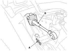 운전석 방향에서 보면 레버에서 미션으로 연결된 케이블이 보인다. 클립 A를 빼고 케이블 B를 분리한다. (케이블을 다시 장착할 때는 클립 고정 부의 돌기부가 위로 오도록 조립해야 한다)